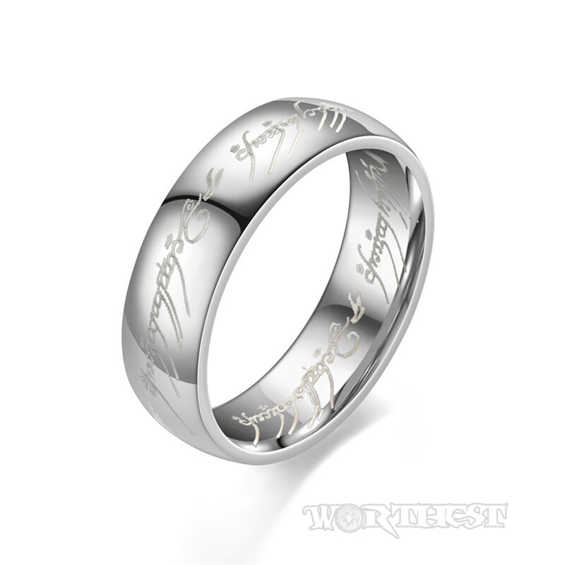 Серебристое кольцо с каноничной гравировкой из легендарного произведения "Властелин колец" завораживает своим простым, но очень значимым дизайном. Ширина кольца составляет 6 мм, а его блестящая поверхность привлекает внимание, подчеркивая изящество гравировки. Надписи выполнены с использованием лазерной гравировки как снаружи, так и внутри кольца, что добавляет ему еще больше ценности и эстетики.