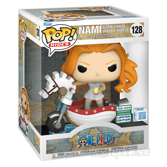 Чарівна й рішуча Намі тепер у лінійці Funko POP! Rides Deluxe! Фігурка зображає її в незвичному та веселому образі — верхи на білій конячці-хобі, стилізованій під ніс корабля. Декоративна підставка з морською хвилею додає динаміки композиції та підкреслює дух пригод, характерний для One Piece. Ексклюзивне видання Wondrous Convention 2025 робить цю фігурку особливо цінною для колекціонерів.