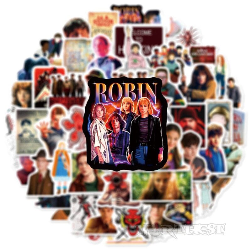 • Добірка з 54 наклейок із ключовими персонажами, антагоністами та символами Stranger Things, актуальними для фінальної арки.